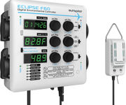 Eclipse F60 has four outlets: Cooling, Heating, Humidify/Dehumidify, Cycle Timer. The three temperature and humidity outlets offer customizable day and night set points while the cycle timer outlet controls any device requiring a repeated on/off function during a 24-hour time period. All four outlets feature heavy duty protective covers that prevent atmospheric moisture from entering the device. A built-in data logger records minimum and maximum temperature and humidity levels.