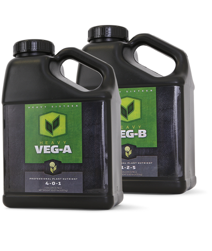 Usage: Use equal parts Veg A & B during the growth phase. Mix 3ml- 10ml each of Veg A & Veg B per gallon of water. *Refer to Heavy 16's nutrient calculator for specific directions.