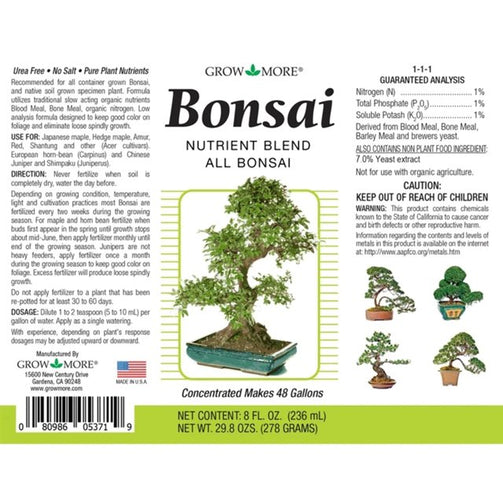 Grow More Bonsai Nutrient Blend is recommended for all container grown Bonsai. It contains slow acting organics such as blood meal, bone meal, and barley meal. The low analysis formula keeps good color on foliage and helps eliminate spindly growth.