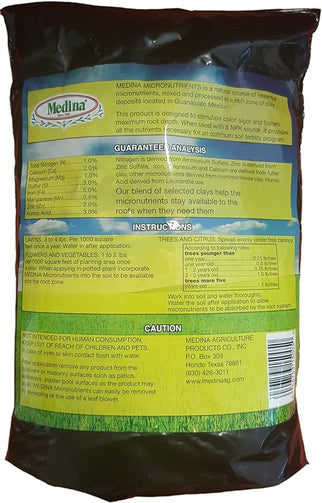 Medina Micronutrients is a natural source of Iron, Zinc, and other important micronutrients designed to stimulate color, vigor, build deeper root systems, and produce stronger plants.
