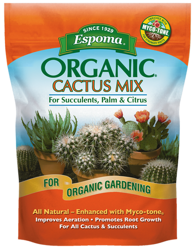 Espoma Cactus Mix is an all-natural potting soil mix for cactus, succulents, palm & citrus. It's a rich, premium blend of sphagnum peat humus, peat moss, sand and perlite that has been enriched with Myco-tone. Provides optimum aeration and drainage, improved moisture retention and reduces drought stress. Also promotes root growth.