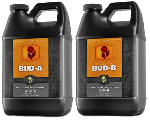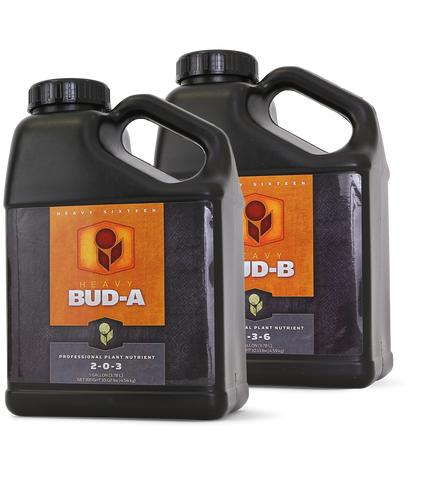 Usage: Use equal parts Bud A & Bud B during the bloom phase. Mix 8ml- 15ml of each per gallon of water. *Refer to Heavy 16's nutrient calculator for specific directions.