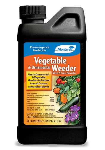 Monterey Vegetable & Ornamental Weeder is a preemergence herbicide for the control of annual grasses and broadleaf weeds in ornamental trees, ornamental woody shrubs, ornamental groundcovers, roses, established flowers and vegetable gardens.