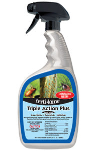 Ferti-lome Triple Action Plus RTU is a broad-spectrum insecticide, fungicide, and miticide used for the control of insects, diseases, and mites on vegetables, fruits, nuts, herbs, spices, roses, flowers, and shrubs around the home. Contains neem oil and so may be used up to day of harvest on fruits and vegetables.