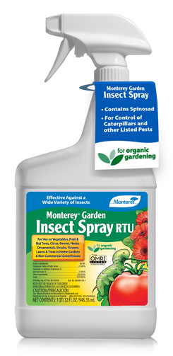 Monterey Garden Insect Spray Ready-to-Use/ RTU is an all-natural insect killer that can be used on outdoor ornamentals, lawns, vegetables, and fruit trees. The active ingredient, Spinosad, is a natural substance made by a soil bacterium that is toxic to insects and can be used to control a wide variety of pests. The addition of insecticidal soap increases it effectiveness and also provides curative control of powdery mildew.